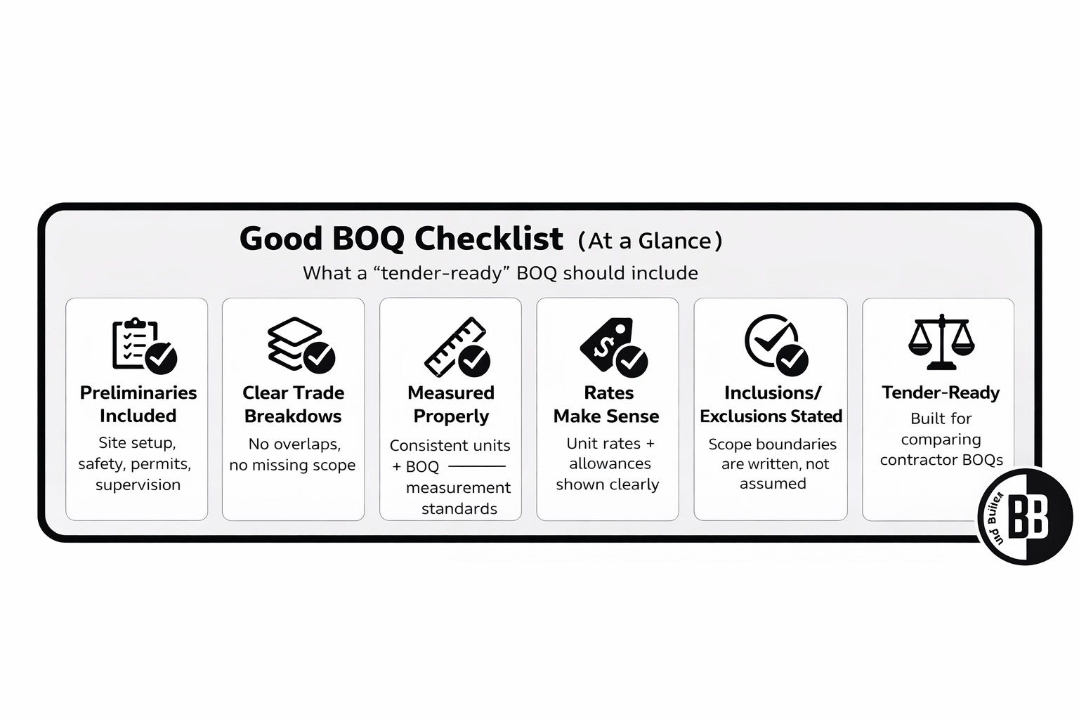 This mini BOQ checklist is a quick way for clients to judge whether a BOQ is “good enough” to price and compare. It keeps scope clarity front and centre and helps you avoid costly misunderstandings. Use it at the end of your review, right before you request tenders.